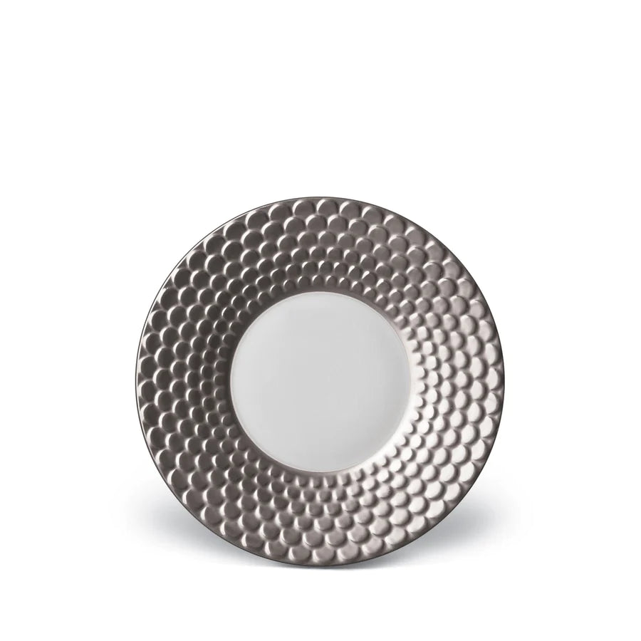 Porcelain saucer hand painted with Aegean wave motif in 24K gold, platinum, or white. Inspired by the Greco-Roman treasures of the ancient world, reimagined for contemporary tables.