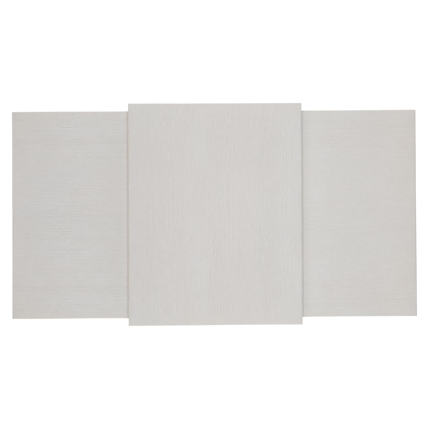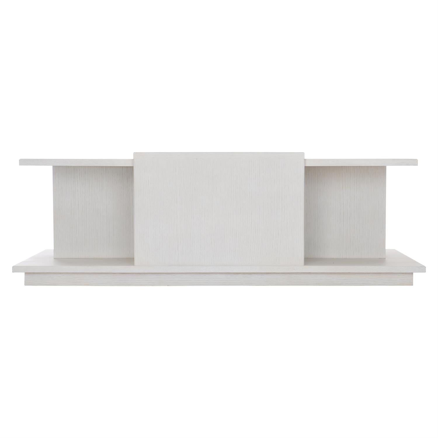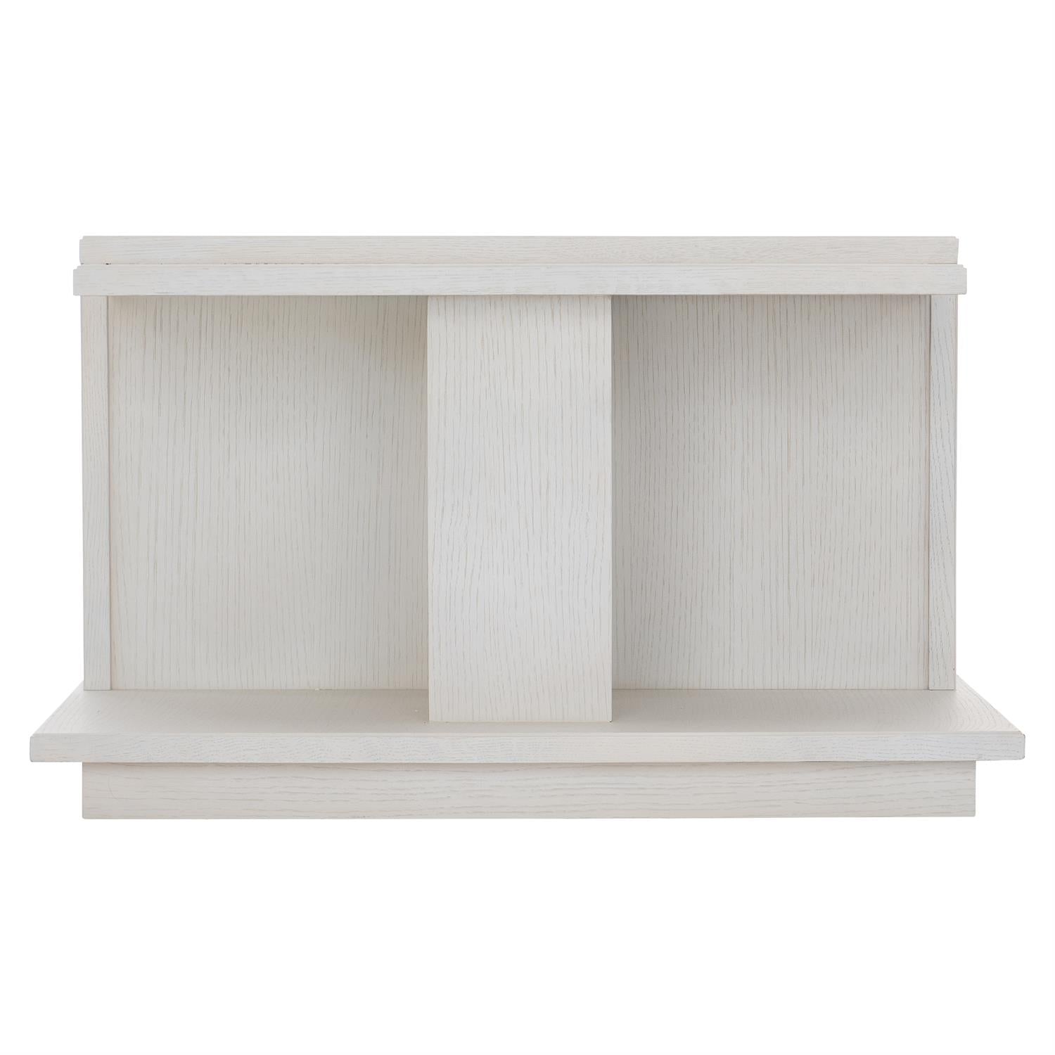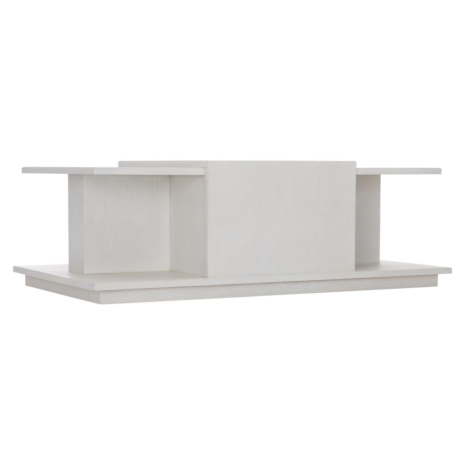 The Arnette cocktail table takes an architectural approach to composition and shape, offering visual variety and multiple surfaces for display. The multilevel top features a taller center section, while the extended base creates a shelf at the corners. Wire-brushed quartered oak veneers in white finish feature a linear wood grain for a look of understated luxury.