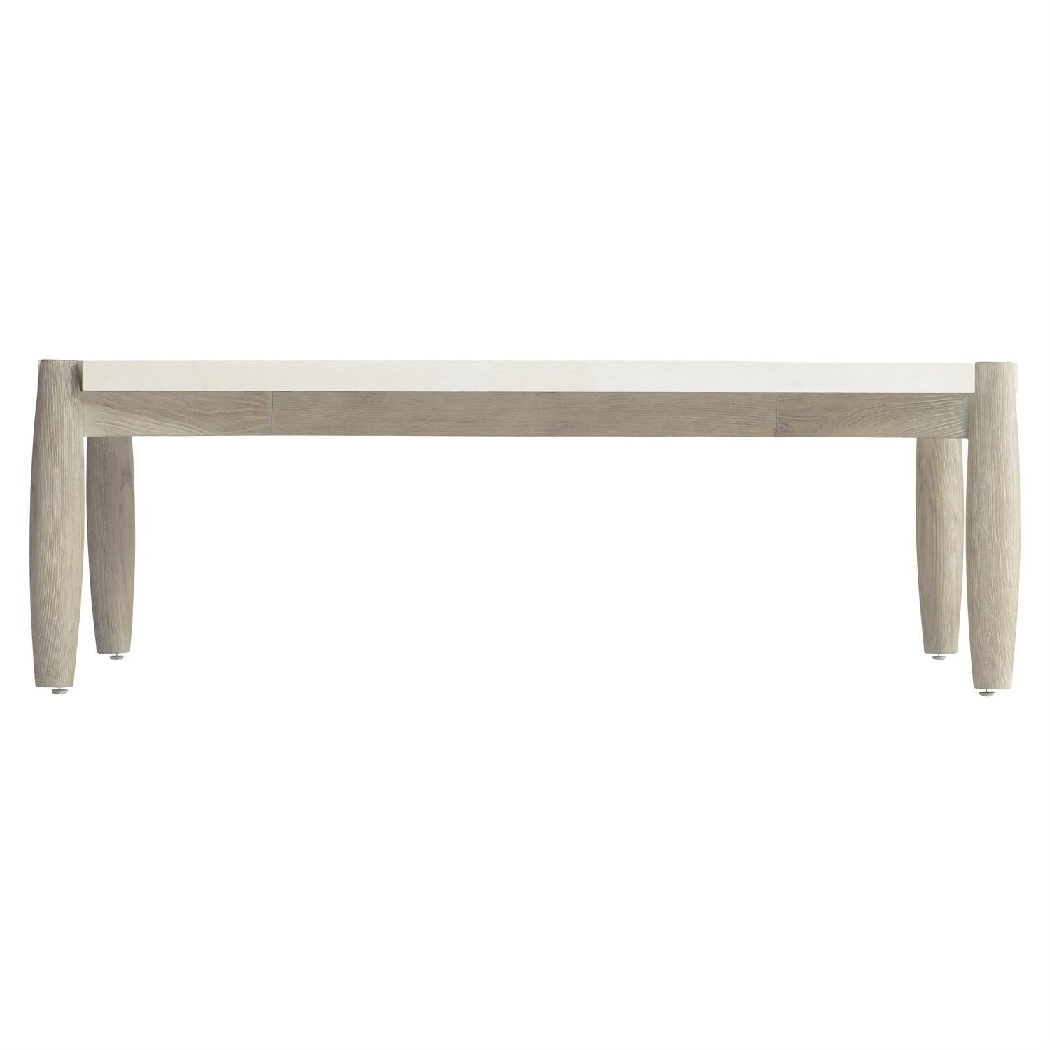 The Ashbrook cocktail table offers a stunning example of modern organic style. A wood top in the Vellum finish has scooped out corners, making it appear to float above the rounded wood frame. The table legs, finished in Weathered Greige, fit like a puzzle into the scooped out corners
