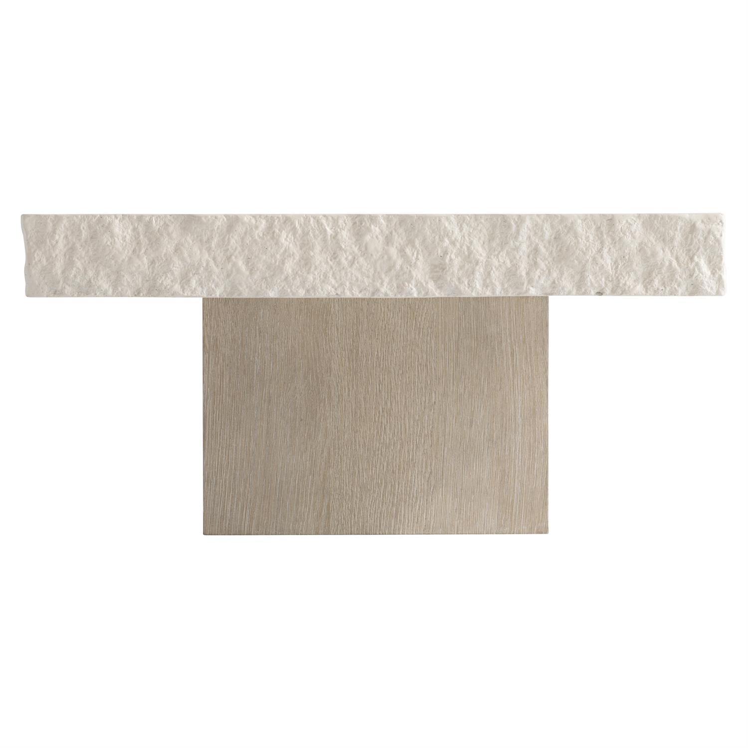 The Beauclair cocktail table takes a modern primitive approach with a textured quartered oak base in the Flaxen finish. A cast concrete top looks like quarried stone with its textured sides and smooth surface in a Vintage Cream finish.