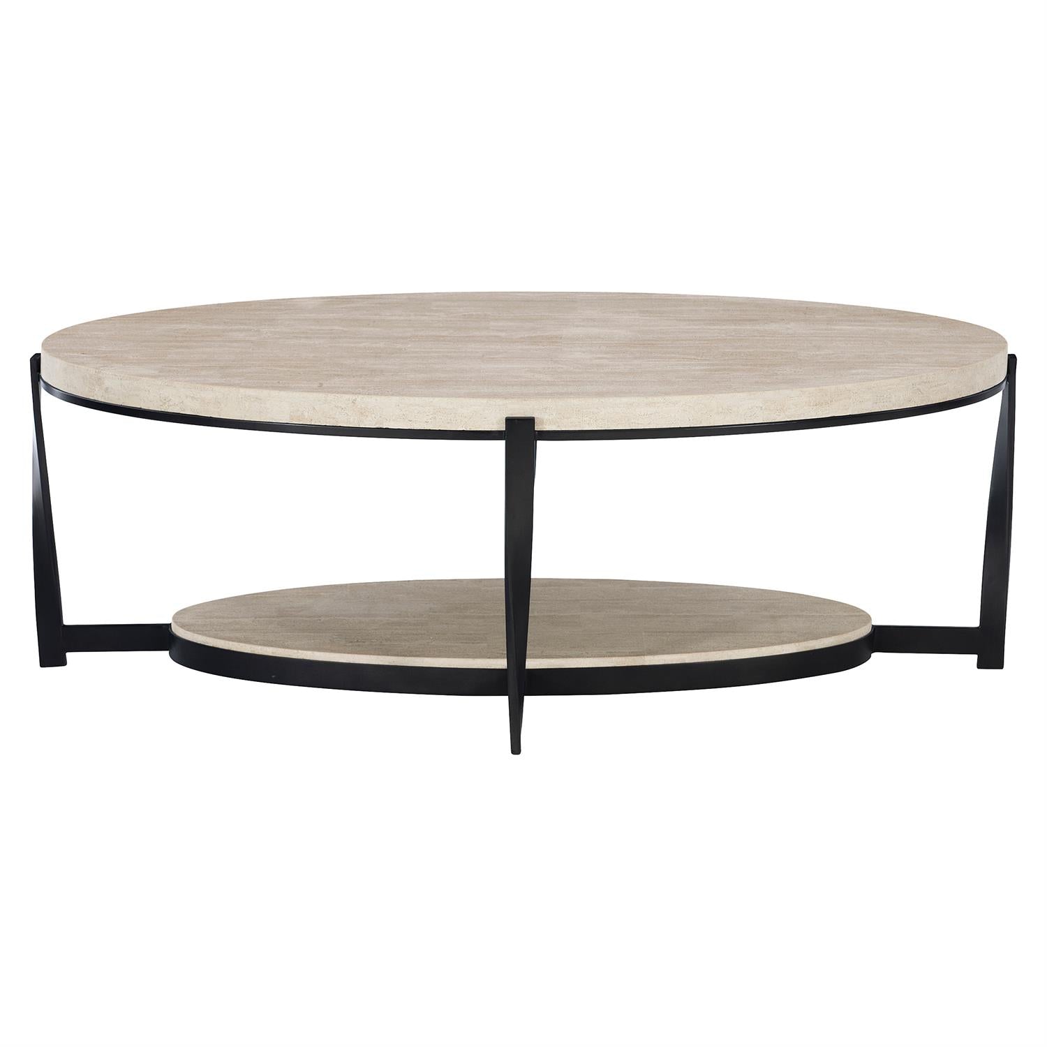 W: 53 in D: 31 in H: 18 iBernhardt Occasional offers a range of upscale designs for luxe living spaces. The Berkshire cocktail table pairs elegant stone surfaces with textured steel. Finished in aged pewter, the dark metal base contrasts with the organic, neutral hues of the stone top and shelf. Twisted steel legs add movement and visual interest.