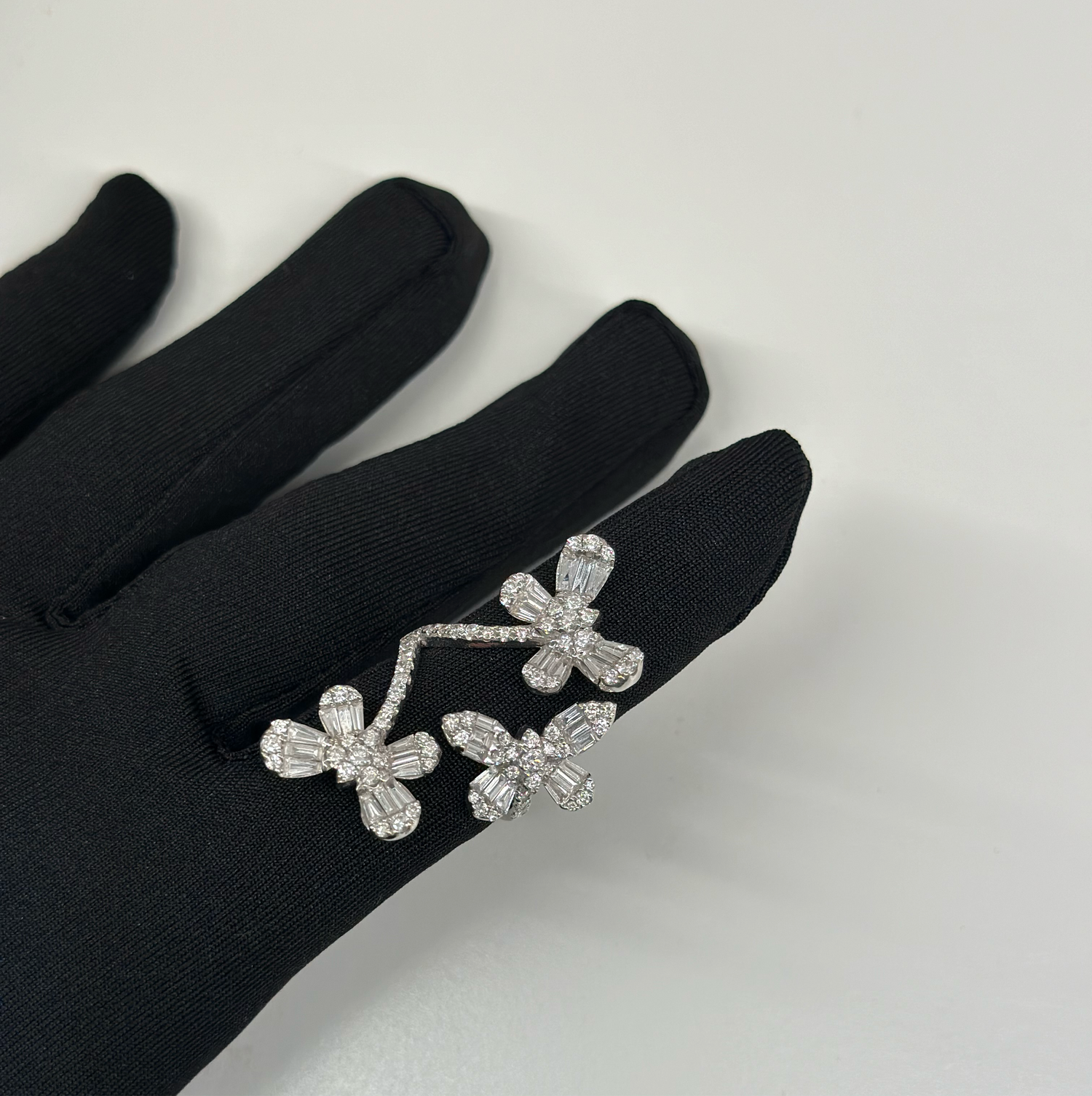 A diamond butterfly ring is a captivating piece of jewelry that combines the elegance of diamonds with the symbolism of butterflies. The ring features three butterfly designs, where the wings are crafted with 18k white gold, and adorned with sparkling natural diamonds. These diamonds are strategically placed to create the illusion of delicate, shimmering wings that capture light from every angle.
