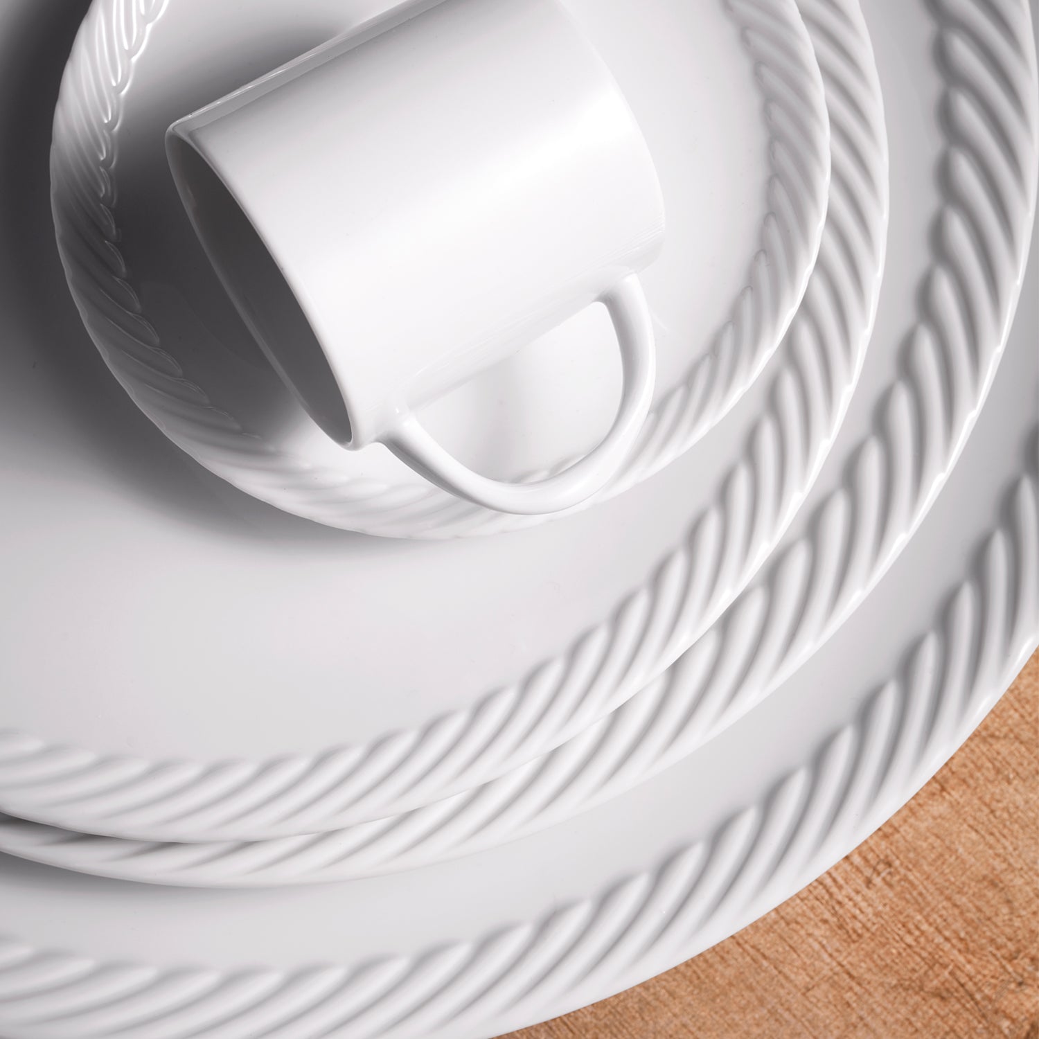 Patterned after old-world silk cords, each arched strand on the Corde collection is hand-painted to create a fully-glazed, modern dining pattern. Each piece is crafted in Limoges porcelain and available in white, 24-karat gold, or platinum.