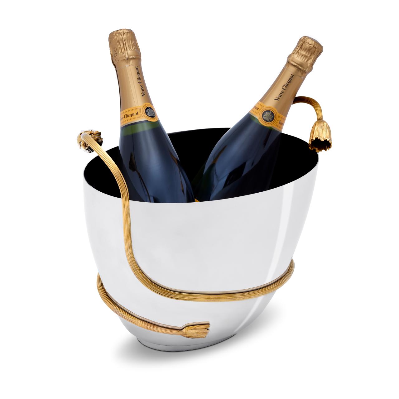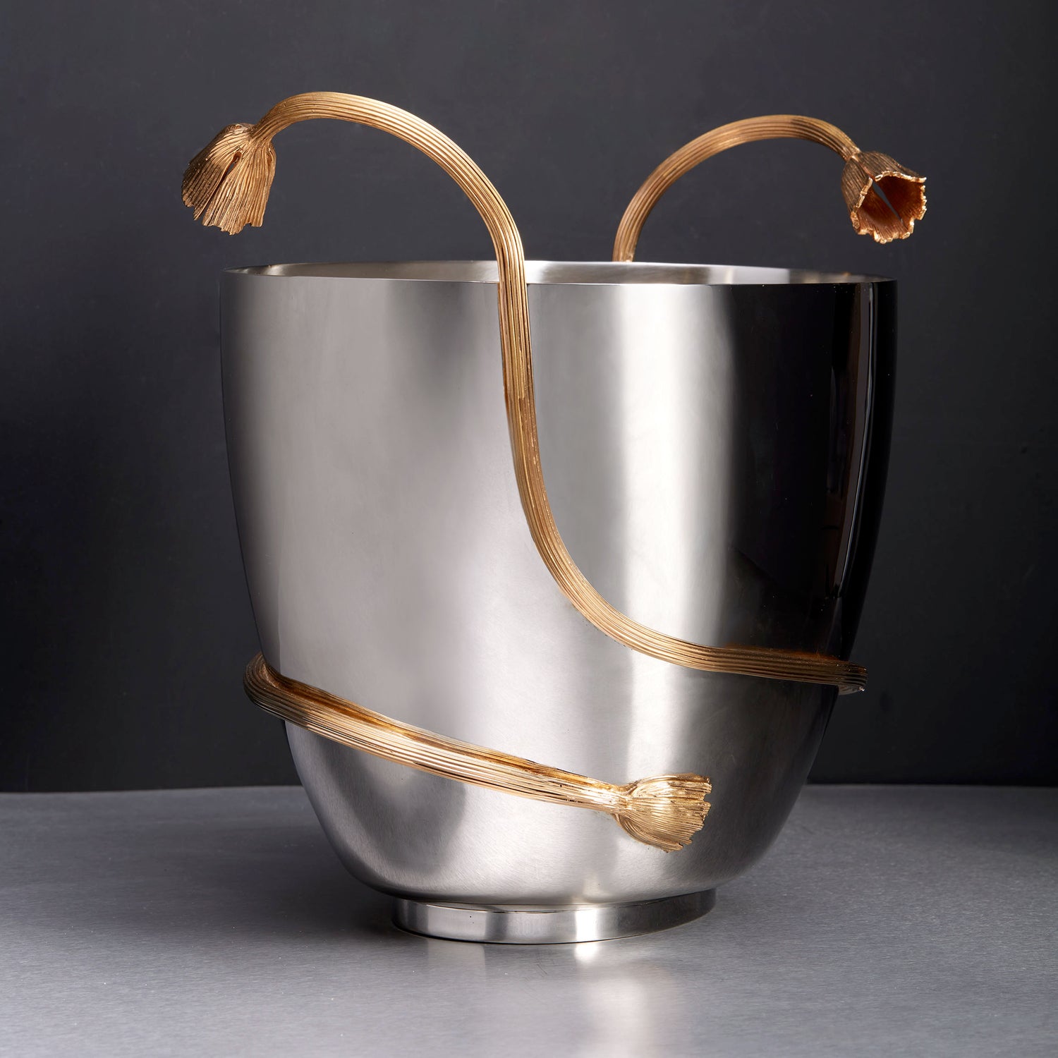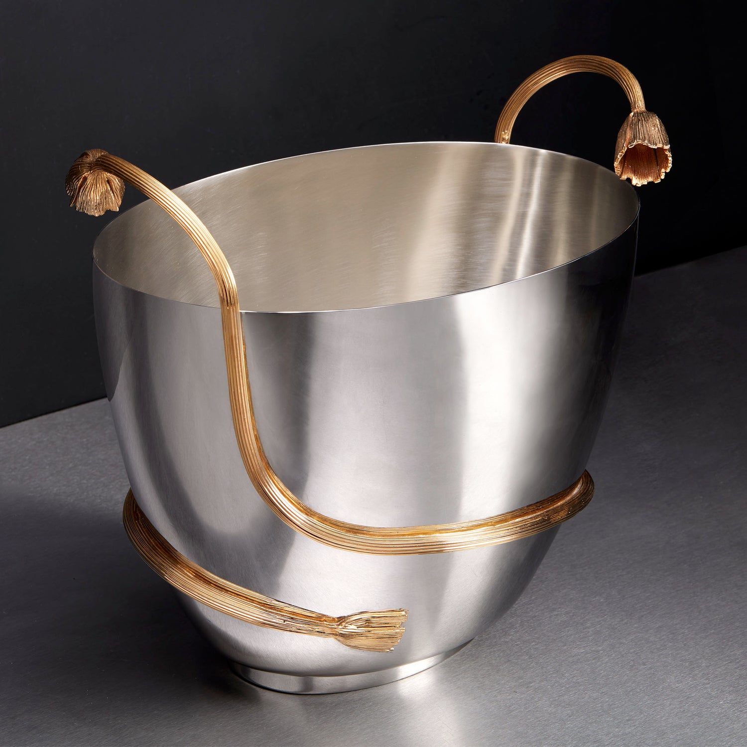 Recalling the grand serving traditions of the early 20th century, the Deco Leaves collection is a richly textured marriage of handcrafted stainless steel and 24K gold-plated accents.