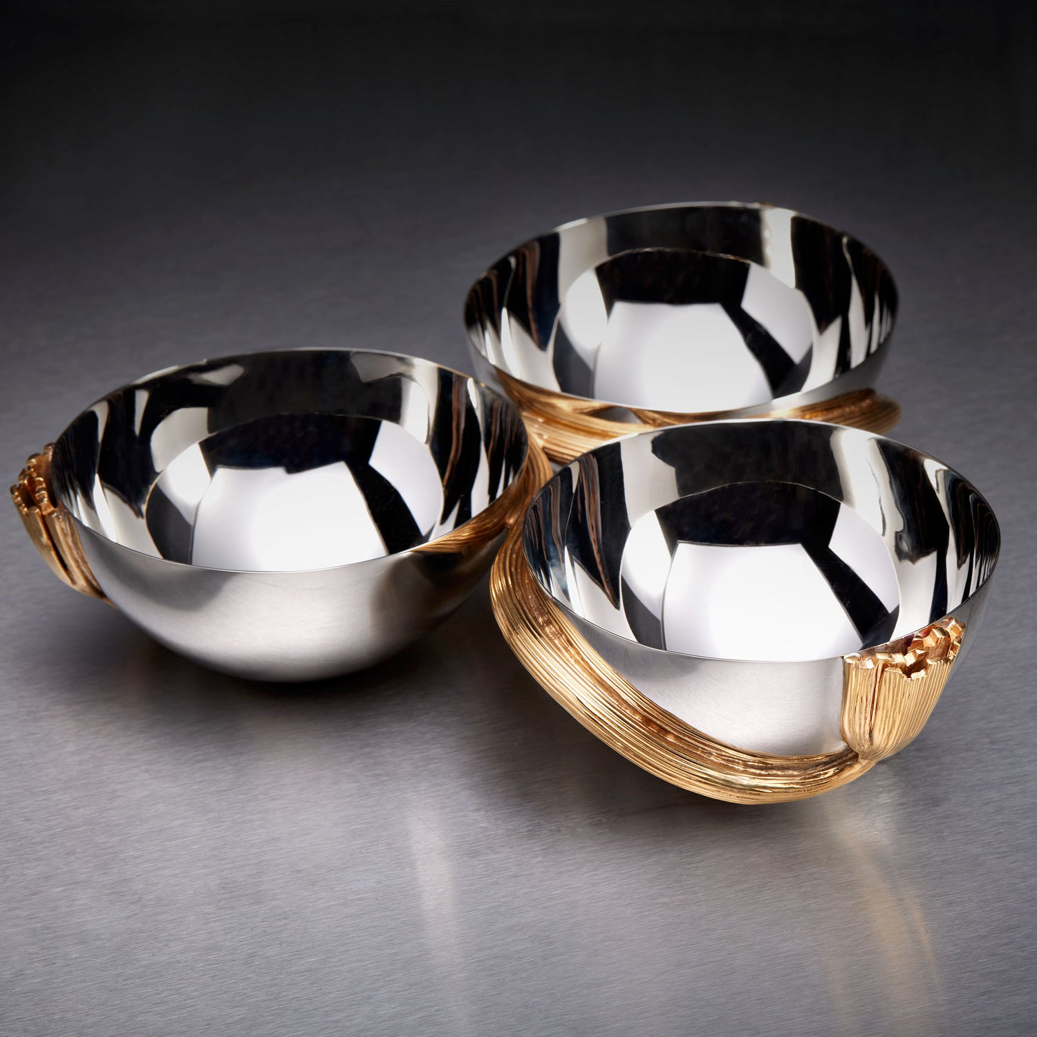 Recalling the grand serving traditions of the early 20th century, the Deco Leaves collection is a richly textured marriage of handcrafted stainless steel and 24K gold-plated accents.