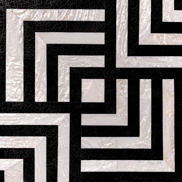 With mesmerizing geometric patterns and graceful styling, the Dédale Rectangular Tray is modern, smart and sophisticated. Be hypnotized by the bold, seemingly shifting shapes created from natural shells. Beautifully handcrafted, with brass detailed handles.