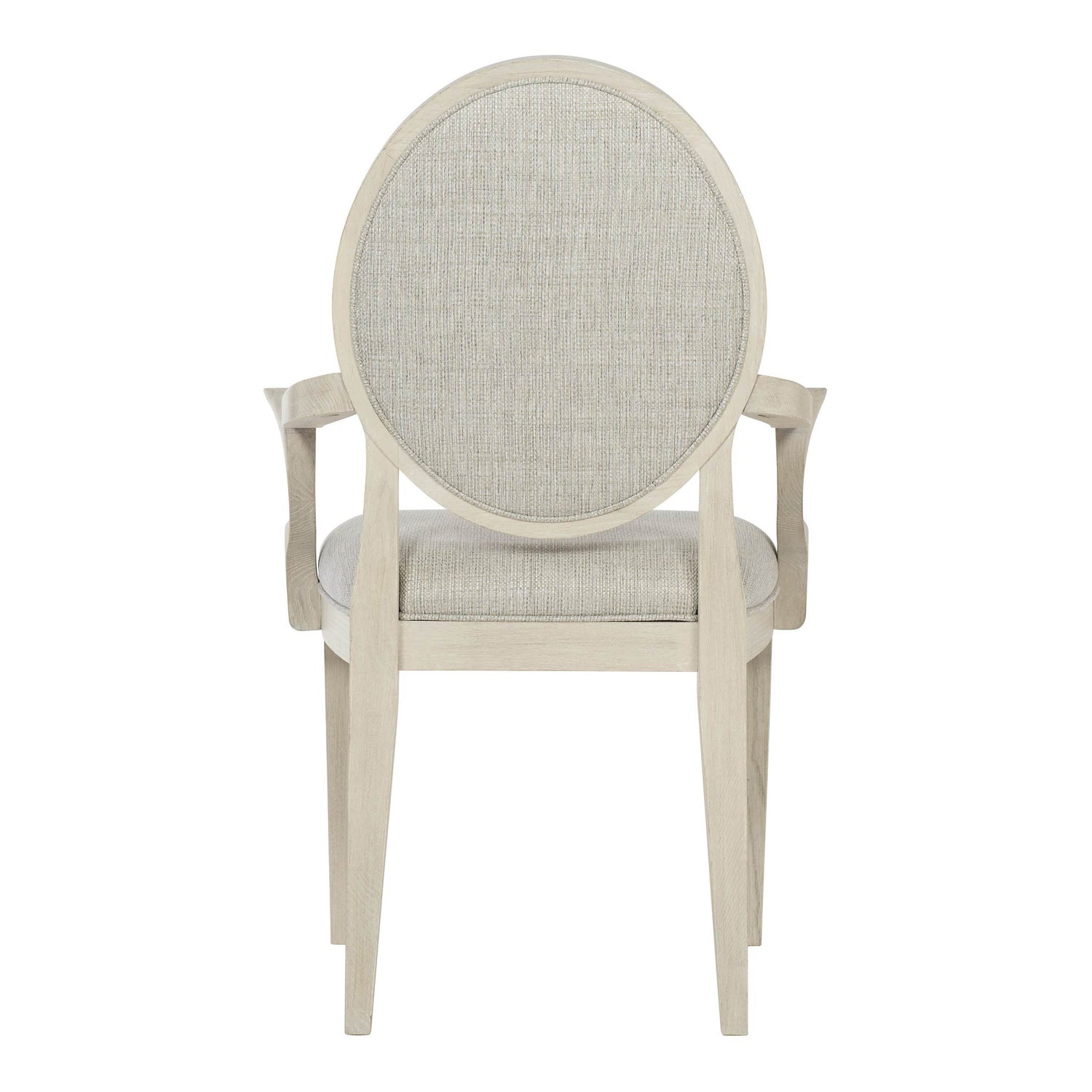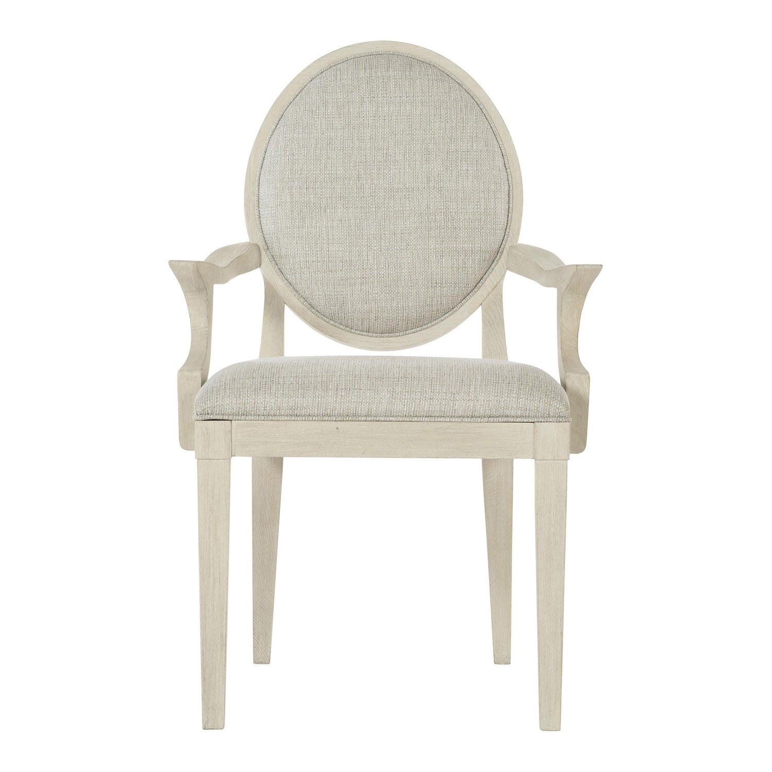 The East Hampton collection is defined by its minimalist aesthetic, achieved through soft finishes, graceful curves and subtle accents. This timeless arm chair is fluid in form with an upholstered oval back, elegant sculpted arms, plush cushioning and gently tapered legs. Blending seamlessly with the light Cerused Linen finish, the muted gray fabric contributes to the sophisticated palette of neutrals. A subtle weave adds softness and texture, highlighting the clean lines and curved shapes.