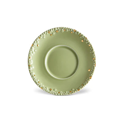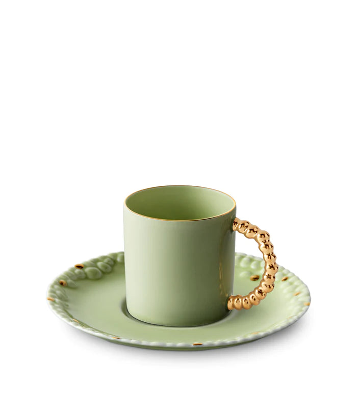A fresh shade in tableware: Mojave Matcha ‚ A soothing and earthy green, selected for its associations with healing and renewal. Porcelain and 24K gold espresso cup and saucer sets with an organic pattern reminiscent of pebbles in the Mojave Desert.
