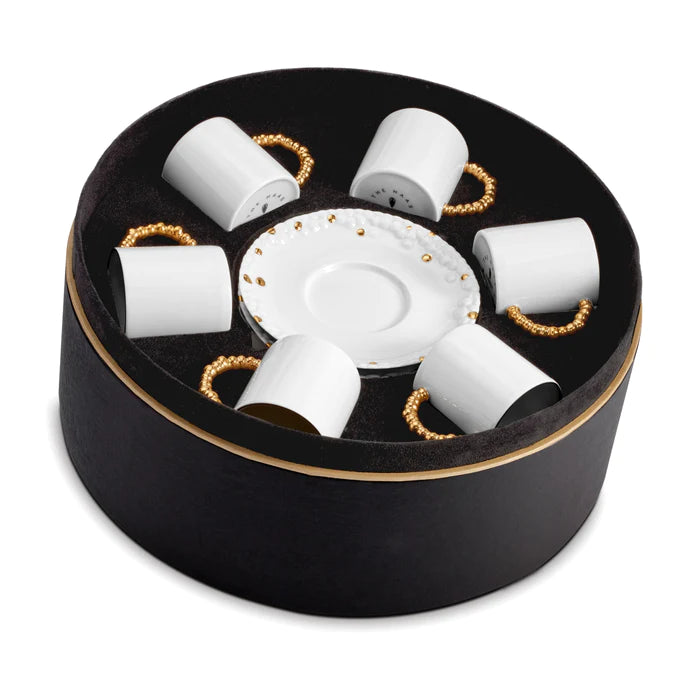 Gift box includes 6 sets of porcelain espresso cups and saucers with 24K gold accents. These objects are to be cherished. In using them, everyday moments become memorable; the ordinary becomes extraordinary.