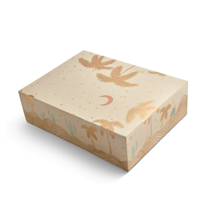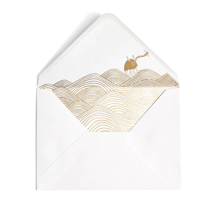 Includes 12 cards and 12 envelopes in a drawer box gold foil stamped with sand textured paper reminiscent of the desert. Dancing across the notecards are 4 colorful monster designs embossed with gold foil. Envelope interior lined with delightful gold foil design.