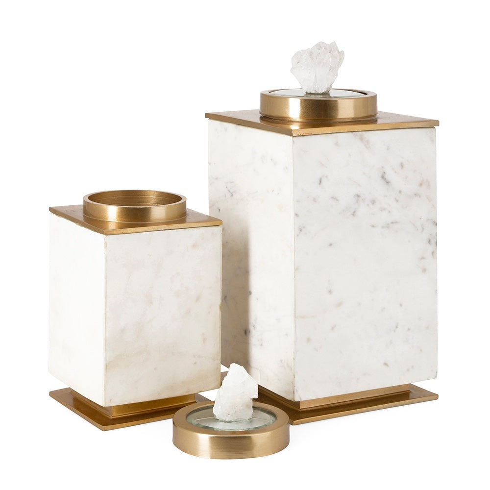 Store your items with style with the Nala decorative canisters. Featuring a cream finish, each canister has a finely polished marble body and a gold-coated lid and base. A perfect decoration for tabletops or desks.